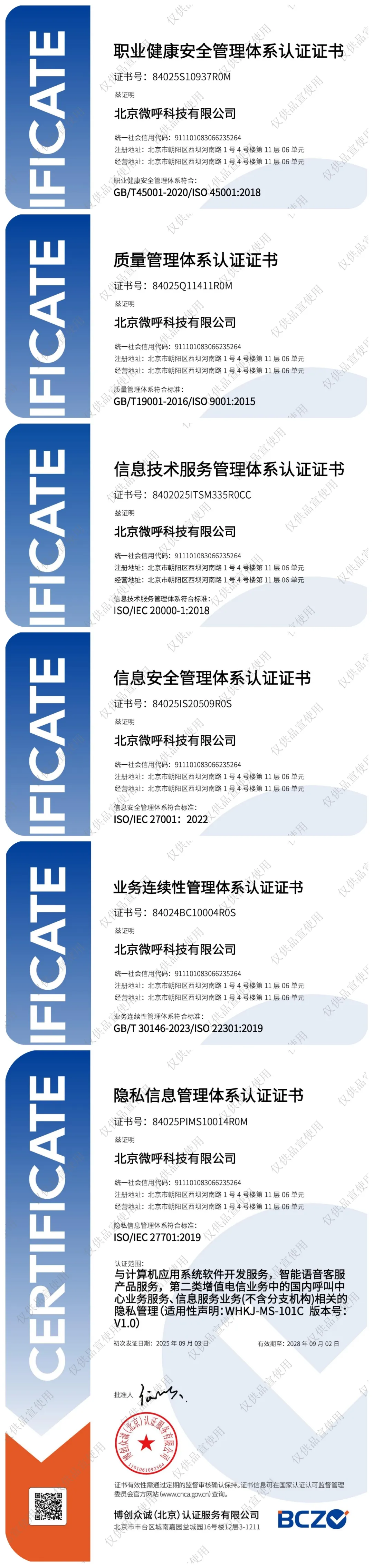 微呼科技将持续优化质量管控、产品交付、服务响应、信息安全等核心环节,不断提升企业核心竞争力;同时,始终以客户需求为导向,推动技术和服务创新升级,提供更安全、更高效、更稳定的解决方案,以实力赢得信赖,与各方伙伴共同成长,共创未来。