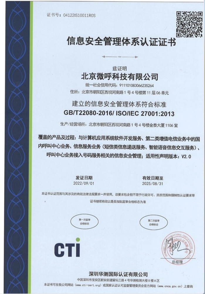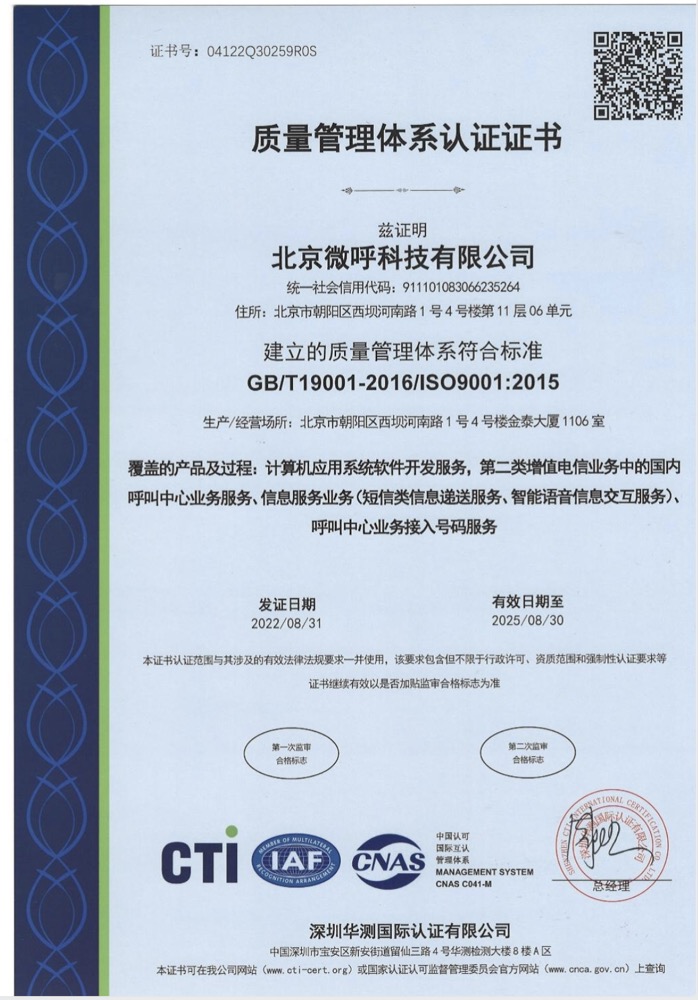 未来,微呼科技会继续坚持贯彻执行已取得的ISO20000、ISO27001、ISO22301、ISO9001四项国际管理体系资质认证标准,严格规范管理企业行为,持续提高技术创新能力,提升服务完善程度,增强企业核心竞争力。微呼科技将不忘初心继续保持在质量、技术、服务、安全、稳定等方面的优势,从多维度持续提升企业管理能力,持续为客户提供稳定、安全、高质、可靠的产品服务,为客户业务的高效运行提供有力支撑,为客户智能化升级贡献微呼力量。