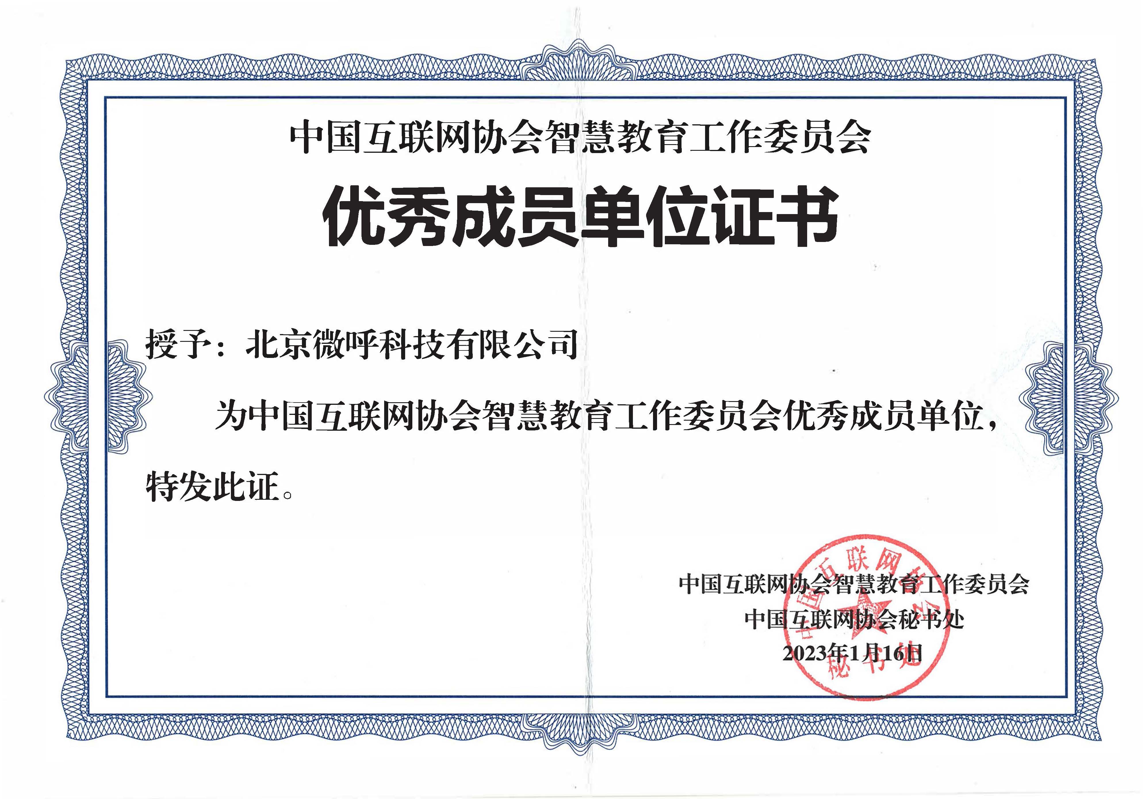 近日,北京微呼科技有限公司(以下简称“微呼科技”)收到了来自中国互联网协会智慧教育工作委员会(以下简称“委员会”)的证书,用以表彰微呼科技于委员会第一届第三次全体成员大会中获评“优秀成员单位”。