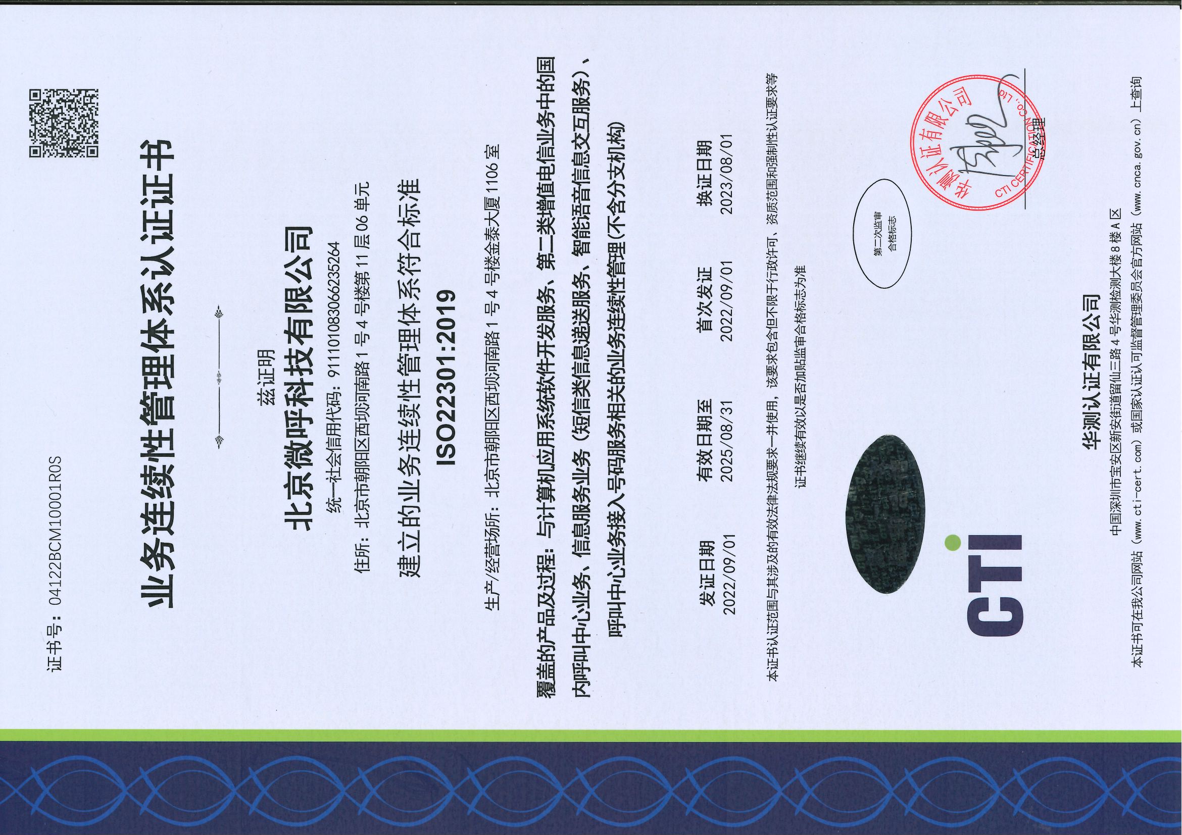 ISO22301业务连续性管理体系认证证书