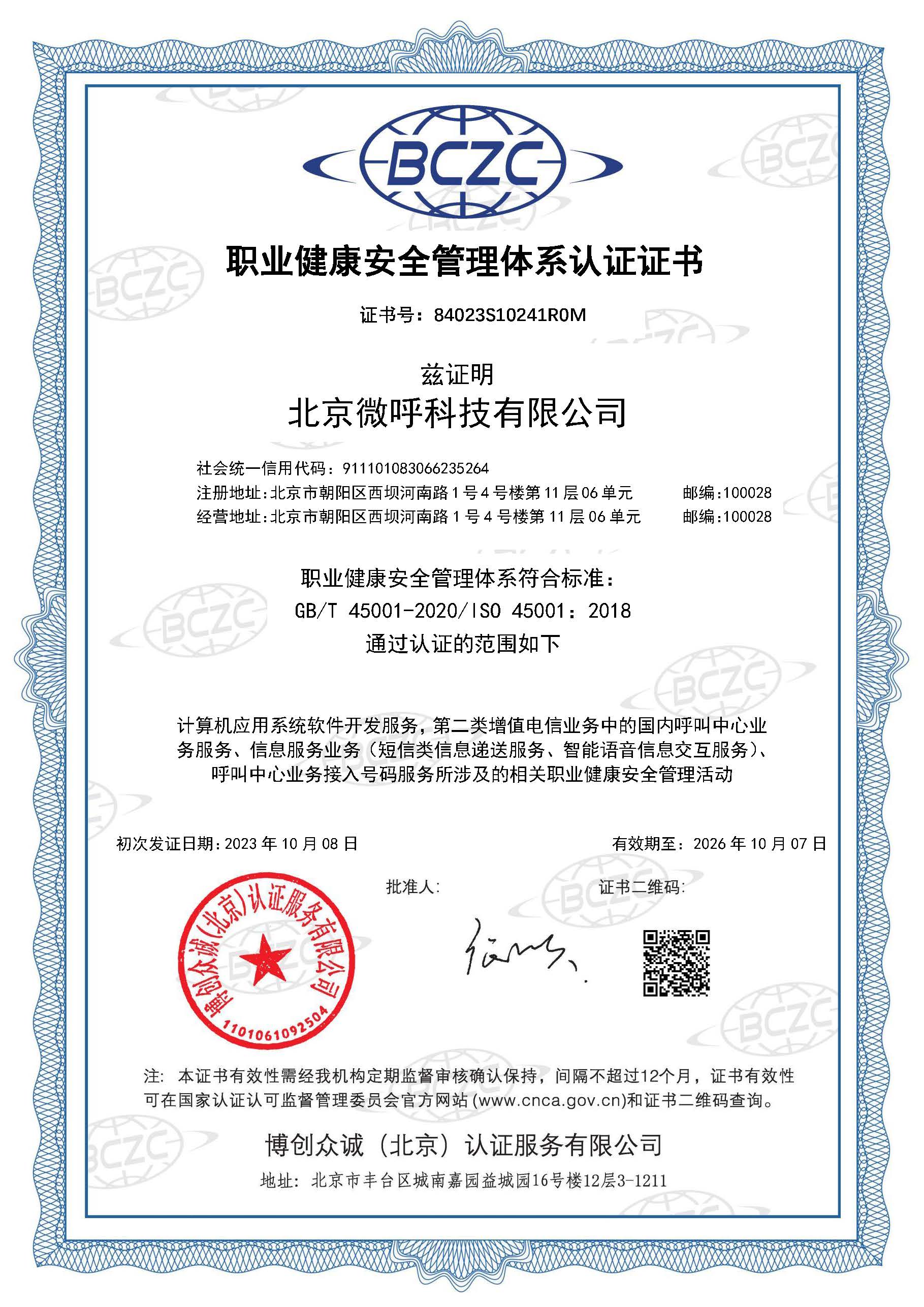 ISO45001职业健康安全管理体系认证是一种国际通用的职业健康安全管理标准,旨在帮助组织建立和维护一个有效的职业健康安全管理体系,以减少工作场所事故和职业病的风险,并提高员工的工作条件和健康安全保障。要求组织建立并持续改进职业健康安全管理体系,以确保员工的健康和安全。微呼科技通过这项认证,表明企业对员工的健康和安全的高度重视,致力于为员工提供一个安全和健康的工作环境,为业务提供有效的连续性保障。