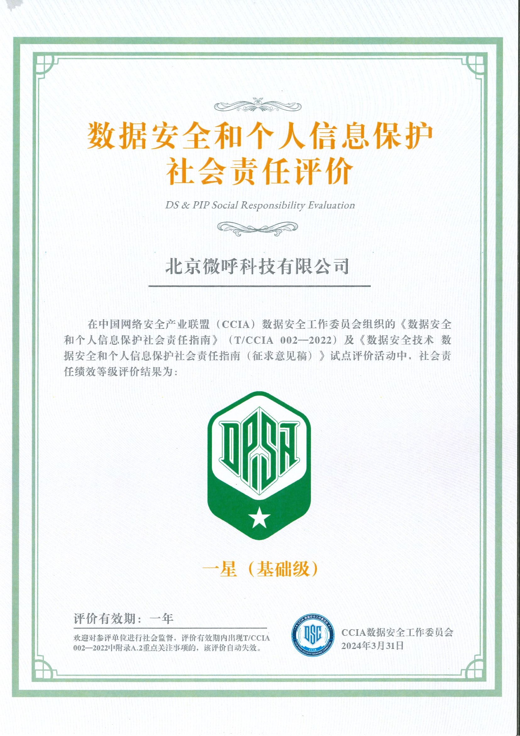 北京微呼科技有限公司(以下简称“微呼科技”)作为相关国标的参编单位,参与了本次试点评价。在组织治理,合规性、创新性和价值体现,公平运行、竞争与合作,消费者权益保护,公益参与和社会发展共5大主题、24个议题中数据安全和个人信息保护社会责任的履行情况符合试点要求,微呼科技获评一星评价。