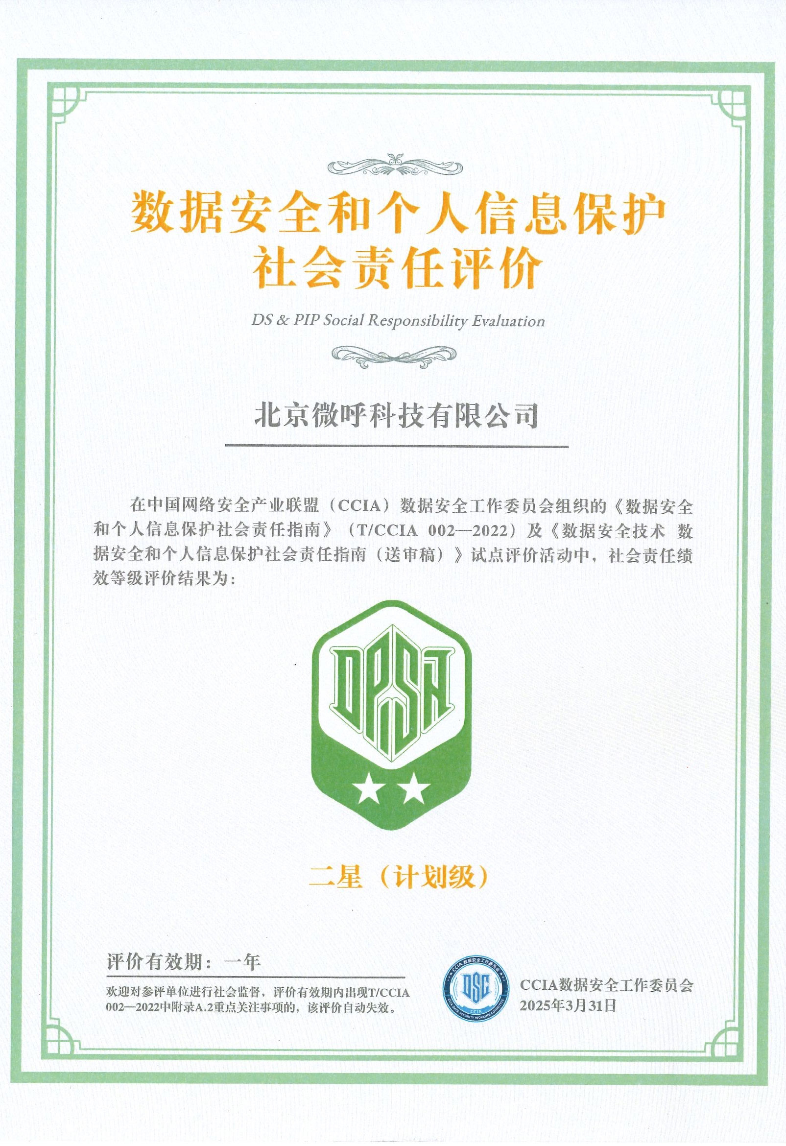 近日,北京微呼科技有限公司(以下简称“微呼科技”、“公司”)参与中国网络安全产业联盟(CCIA)举办的“数据安全和个人信息保护社会责任评价”,被评为二星级。该评价旨在引导全社会共同维护数据安全和个人信息保护,促进形成数字经济发展的良好环境,主要考察企业在数据安全和个人信息保护方面的治理情况、业务合规性、用户权益保护情况,以及对行业和社会的贡献。