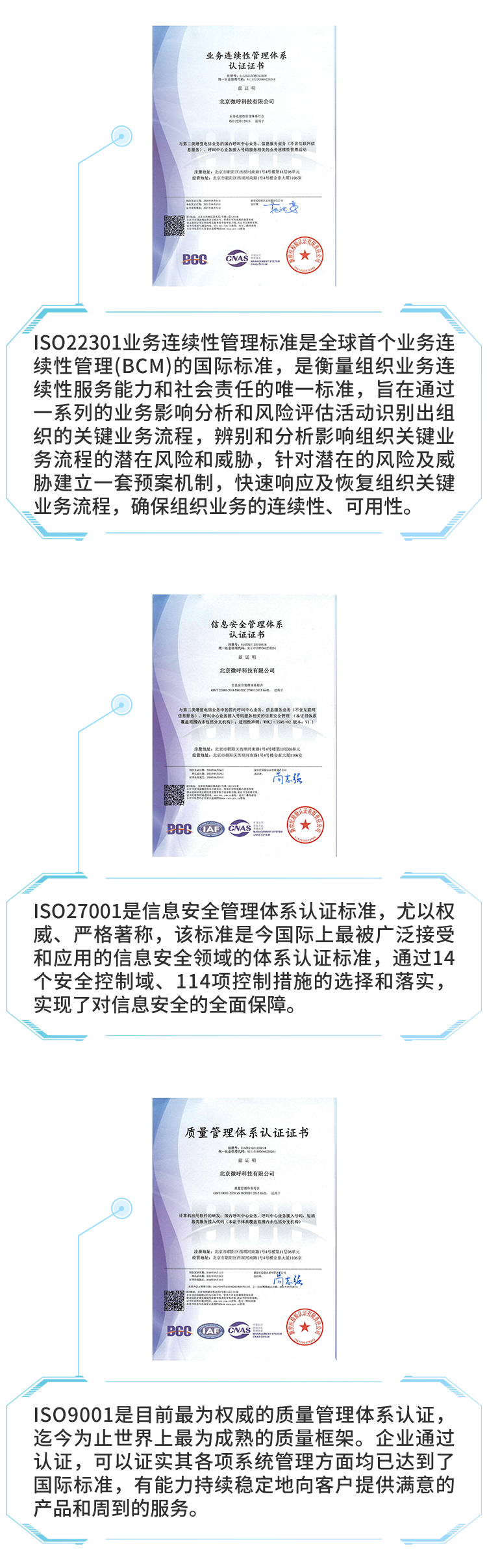 历年认证机构现场审核的顺利通过,印证微呼科技一直秉承谨慎认真的态度,持续重视管理体系要求,贯彻运行ISO质量管理、信息安全管理和业务连续性管理认证标准,充分展现了微呼科技在行业内的管理优势,是对客户和行业合作伙伴的信任及业务保障的最好证明。