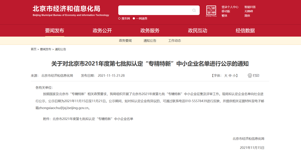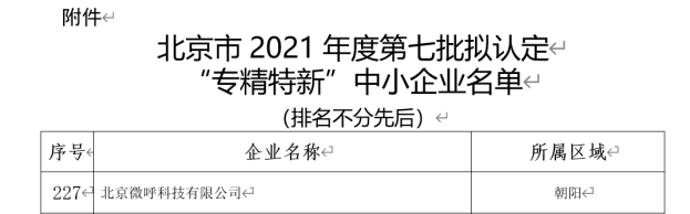 在历经公示期后,北京微呼科技有限公司(以下简称“微呼科技”)于2021年11月22日正式获批北京市“专精特新”中小企业认证。